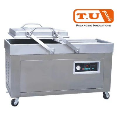 เครื่องซีลสูญญากาศแบบห้องสูญญากาศคู่ (Double Chamber Vacuum Sealing Machine)เครื่องซีลสูญญากาศเหมาะสำหรับแพ็คเพื่อยืดอายุการเก็บรักษาอาหาร เช่น อาหารทะเล เนื้อ ไส้กรอก ฯลฯ ถุงที่นำมาแพ็คต้องเป็นพลาสติกชนิดพิเศษเคลือบไนลอน ซึ่งสามารถป้องกันการซึมผ่านของก๊าซออกซิเจนได้